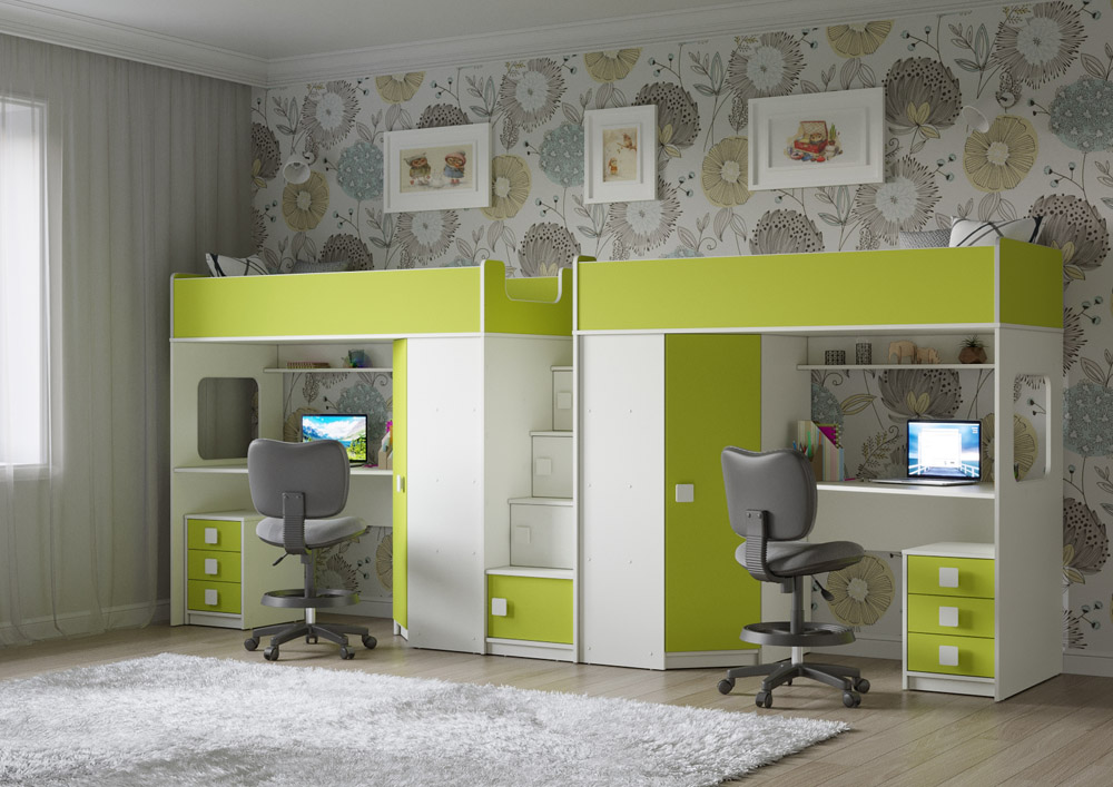 Под спальным местом для каждого ребенка располагается рабочее место с встроенным столом и тумбой.