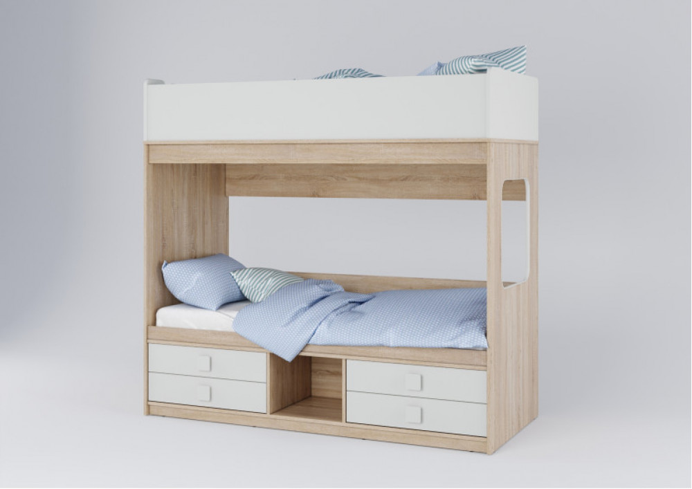 Под нижним ярусом раполагаются 4 выдвижных ящика. Теперь у каждого ребенка есть свои места хранения вещей и игрушек.